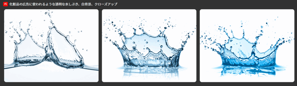 しかし、Adobe Fireflyを使えば、プロンプト入力だけで短時間に高品質な「水しぶき素材」を生成することが可能です。