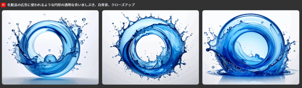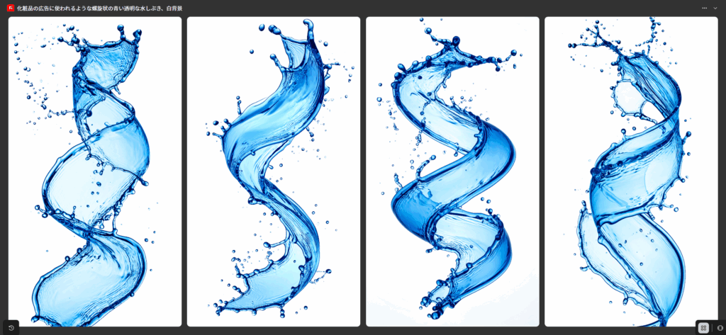 プロンプト「化粧品の広告に使われるような水しぶき、白背景」と入力して生成してみました。